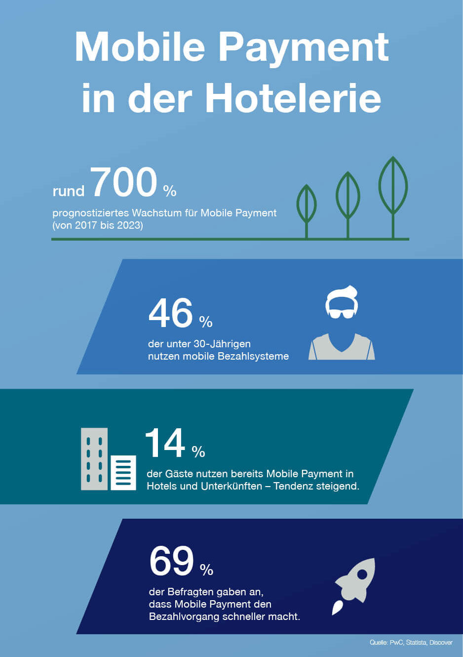 Insgesamt geben ausländische Gäste über 6 Mrd. EUR für Ihre Unterkunft aus. Und auch vor der Hotellerie macht Mobile Payment nicht halt. So nutzen bereits 14% der Gäste Mobile Payment in ihrer Unterkunft: Und das Wachstum bis zum 2023 wird auf rund 700% geschätzt!